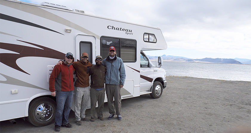 There are advantages to standing tall above the waters surface: sight fishing the cruising trout along the shoreline, the freedom of movement for a long cast, and reaching some of the drop lines that are located 100 feet offshore. Some of the ladders seen on Pyramid are fully loaded version with swivel seats on top, but a 4-6 ft standard a frame will work just fine. Don’t be fooled though, there are also many drop lines that can be found a rods length away from the water line, eliminating the need for ladders. A topo map showing depth of the lake is key for productive shoreline fishing. This will expose prime spots where the drop line is next to shore. Weather permitting, pontoons and u-tube boats can also be a great tool for navigating and standing along the drop line with the promise of reasonable wind. After experiencing the lake during spring the previous two years, the promise of 20 plus lb pilot peak strain Lahontan cutthroat trout that where stocked in 2006 growing at an estimated rate of ½ inch per month was irresistible. So in November after seeing giants landed in reports the fall before, Angus, Phil, Jeff, and I reserved an RV in Reno named “fish bus” and headed to the beaches we would call home for the next 4 days.