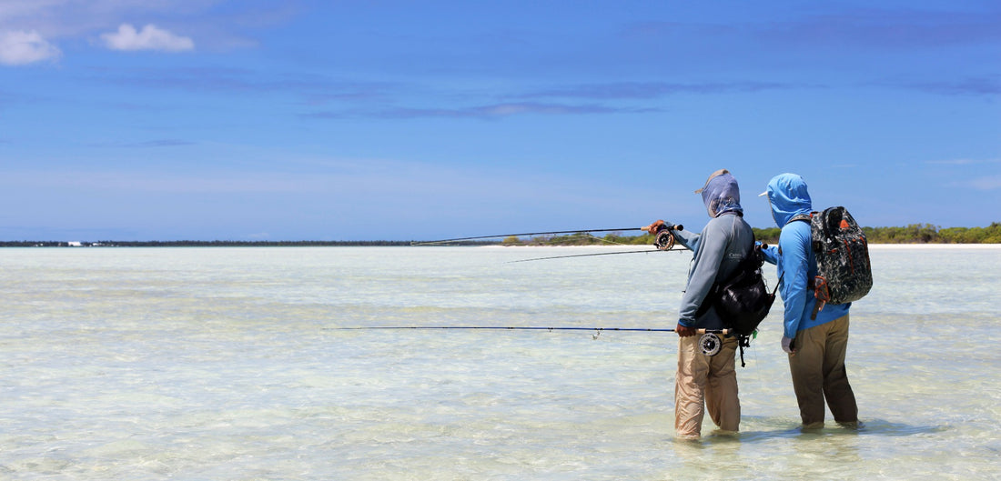 When fishing on your own, having a speedy way to access your GT outfit and get your fly airborne is imperative. We prefer to rig the bigger rod with the fighting butt tucked into a Quikshot Rod Holder. In this way, anglers can fish bonefish while always keeping a keen eye out for GT. When a GT shows itself, switch out the 8-weight for your 12-weight and quickly get into position to get a fly in front of the fish. I highly recommend practicing it a few times because it doesn’t always work smoothly while under pressure. I will be the first to admit that, more often than not, my bonefish rod ends up lying on the flats somewhere because I am too focused on the larger fish to actually get it strapped back onto my pack. To date I have always been able to go back and find it after the GT event was over. However, on two separate occasions at Christmas Island, it took a considerable amount of time because when I was off chasing down the GT, a bonefish came by, picked up my fly and hooked itself! The enterprising bonefish then proceeded to drag my whole outfit to a completely new location.